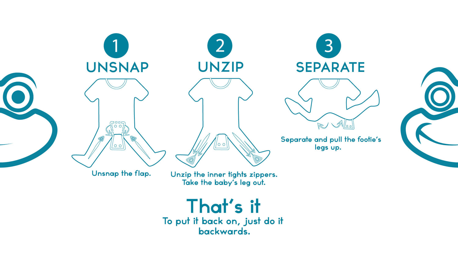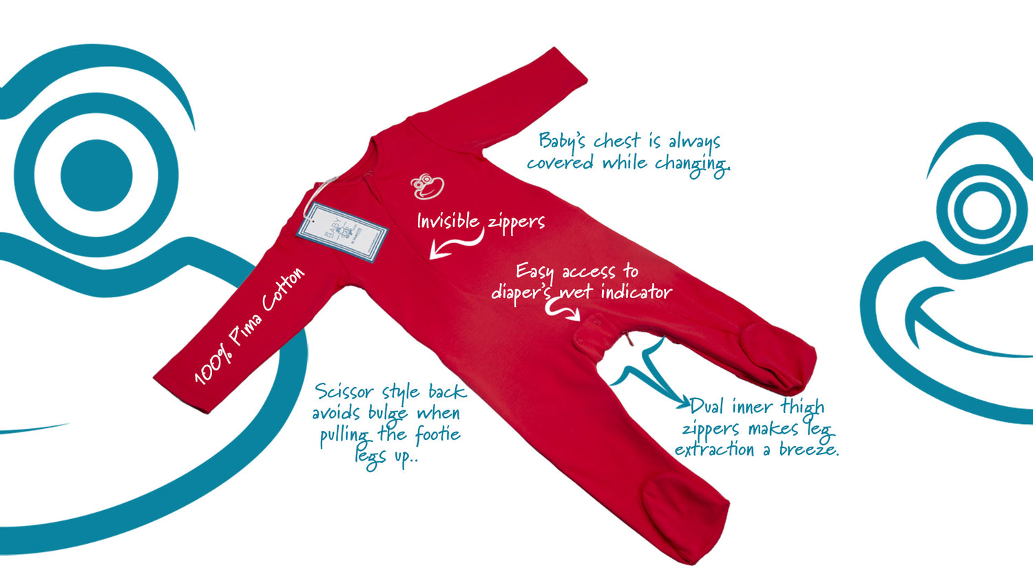 The footie that makes changing a diaper a breeze. Just unsnap, unzip and you are ready to change the diaper. The footies are 100% Peruvian Pima Cotton, the softest cotton in the world. With its strategically inner tights zippers and patent pending design makes this footie the easiest and fastest changing footie you will ever use.
